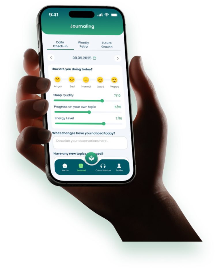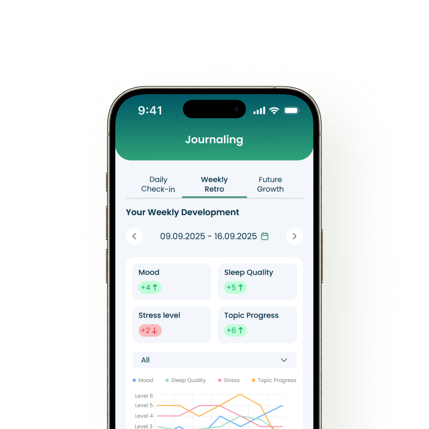 Track your mood, sleep quality, and stress daily with journaling and visualize progress with intuitive analytics.